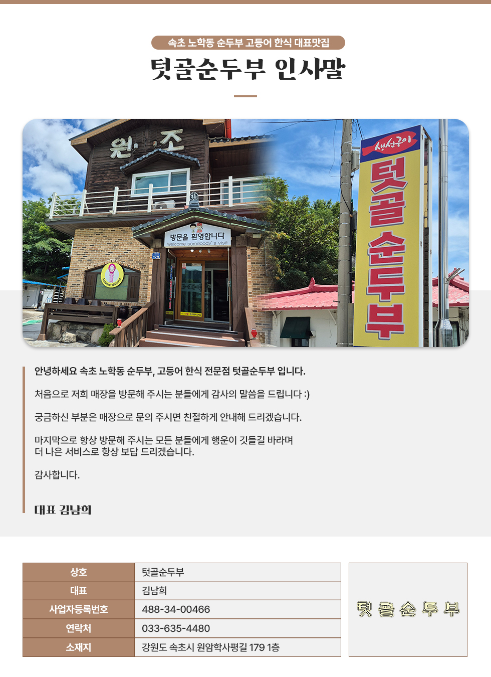 • 상호명 : 텃골순두부 | 대표 : 김남희 | 주소 : 강원도 속초시 원암학사평길 179 1층 | 대표전화 : 033-635-4480 사업자등록번호 : 488-34-00466